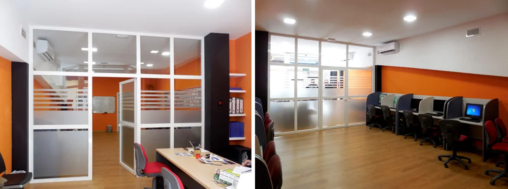 Al final, hemos conseguido crear una zona de recepción de nuevos clientes separada por un ventanal de vidrio que proporciona al aula privacidad y luz natural. Junto con el nuevo parquet, las paredes recién pintadas, el mobiliario y los nuevos equipos ¡la escuela es un lugar moderno y adecuado para los estudiantes!