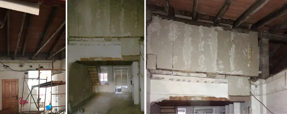 Después de arreglar las goteras en el techo, aconsejamos a nuestros clientes a aislar el piso contra el calor y el frío. Estuvieron de acuerdo pero también querían restaurar y mantener las vigas de madera originales expuestas. Lo hemos conseguido, usando 2 tipos de aislamiento: material termoreflexivo y lana de roca de gran espesor y la instalación del pladur en todo el techo.