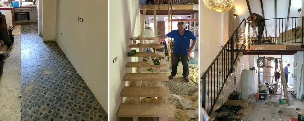 Tras el gran trabajo de reparación y acabado de las paredes y el techo, nos empezamos en los detalles finales de la instalación de nuevas lámparas de techo, los nuevos azulejos, nuevas escaleras, un armario construido con puertas vintage seleccionadas por nuestros clientes, e instalando una barandilla en el altillo para mantener la sensación del espacio fresco y abierta.