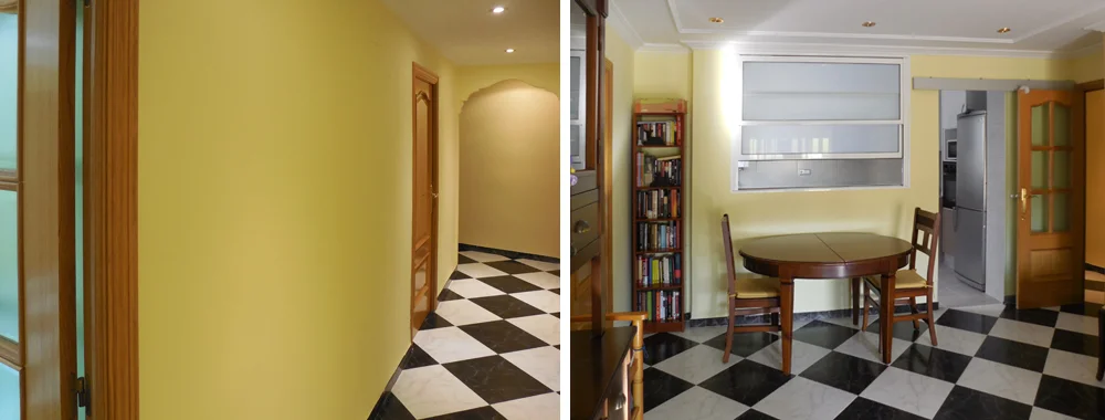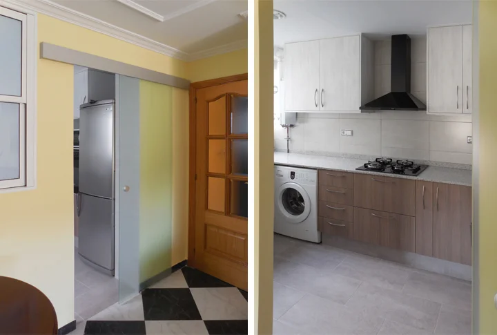 Cerramos la puerta original del pasillo y creamos una nueva entrada con una puerta corredera de cristal en el comedor. / We sealed the original door in the hallway and created a new entrance with a sliding frosted glass door in the living room.