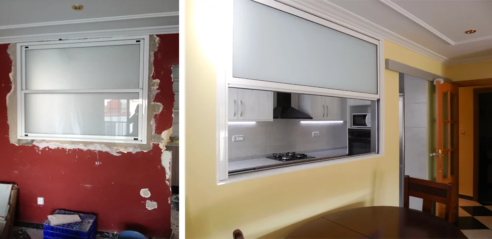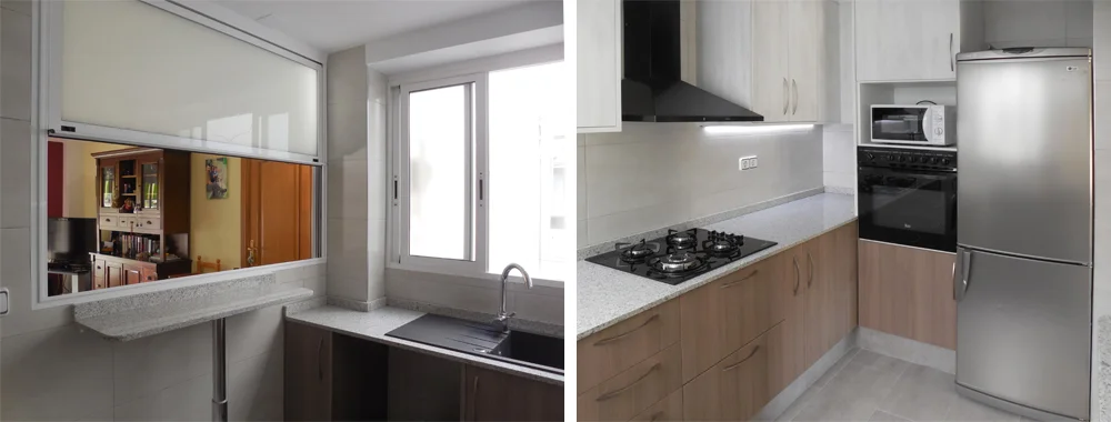 La entrada de la cocina de nuestros clientes estaba originalmente en un pasillo. Además, daba la sensación de pequeña y estrecha, así que querían que estuviera abierta e integrada con el resto de la casa. Para solucionar esto, hemos propuesto la instalación de una ventana grande conectada al comedor que deja pasar la luz desde su terraza pudiéndose dejar abierta o cerrada.